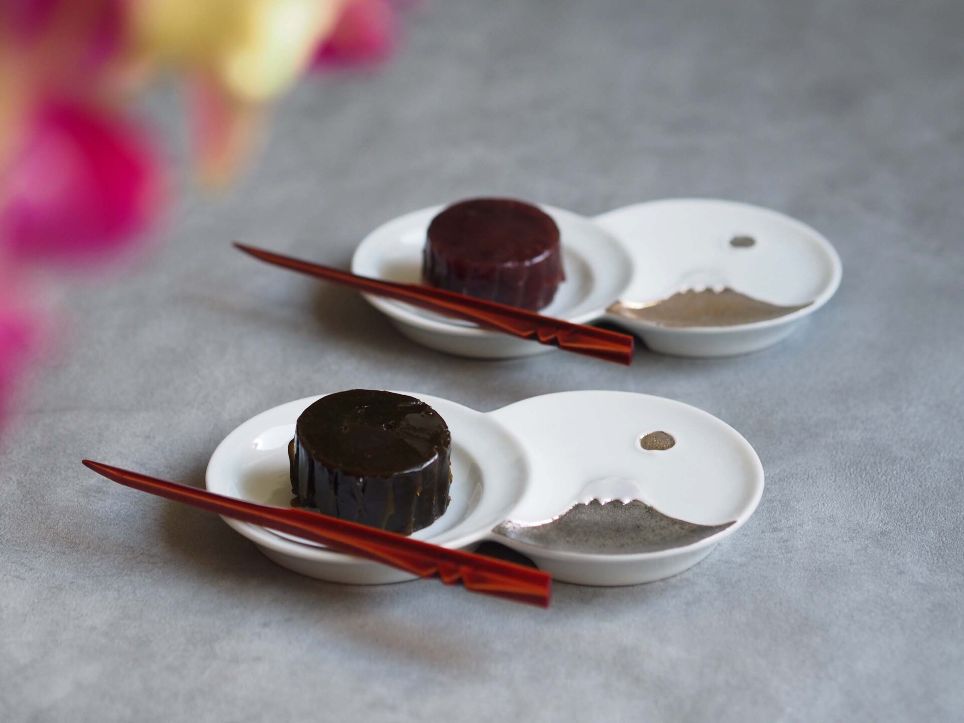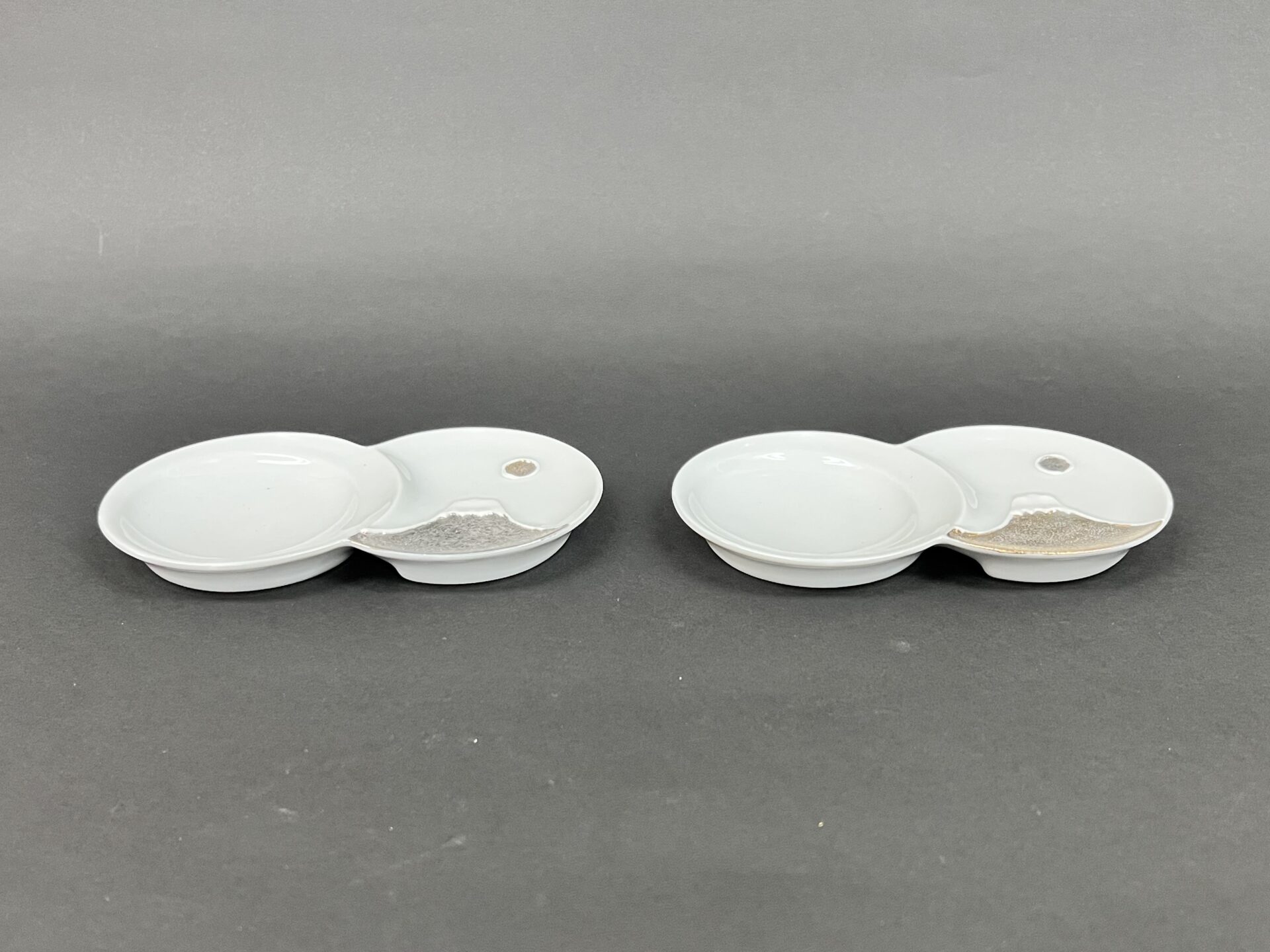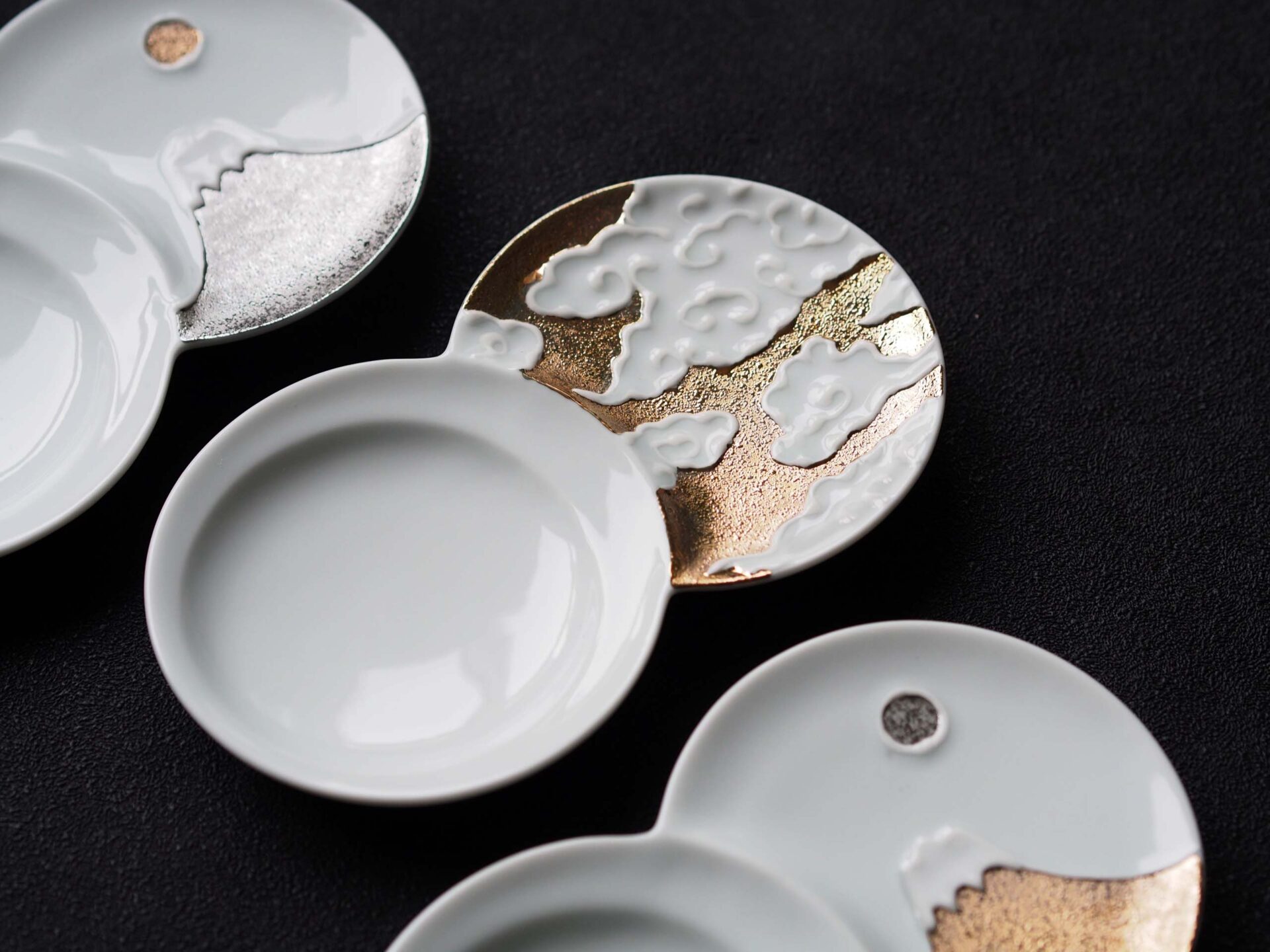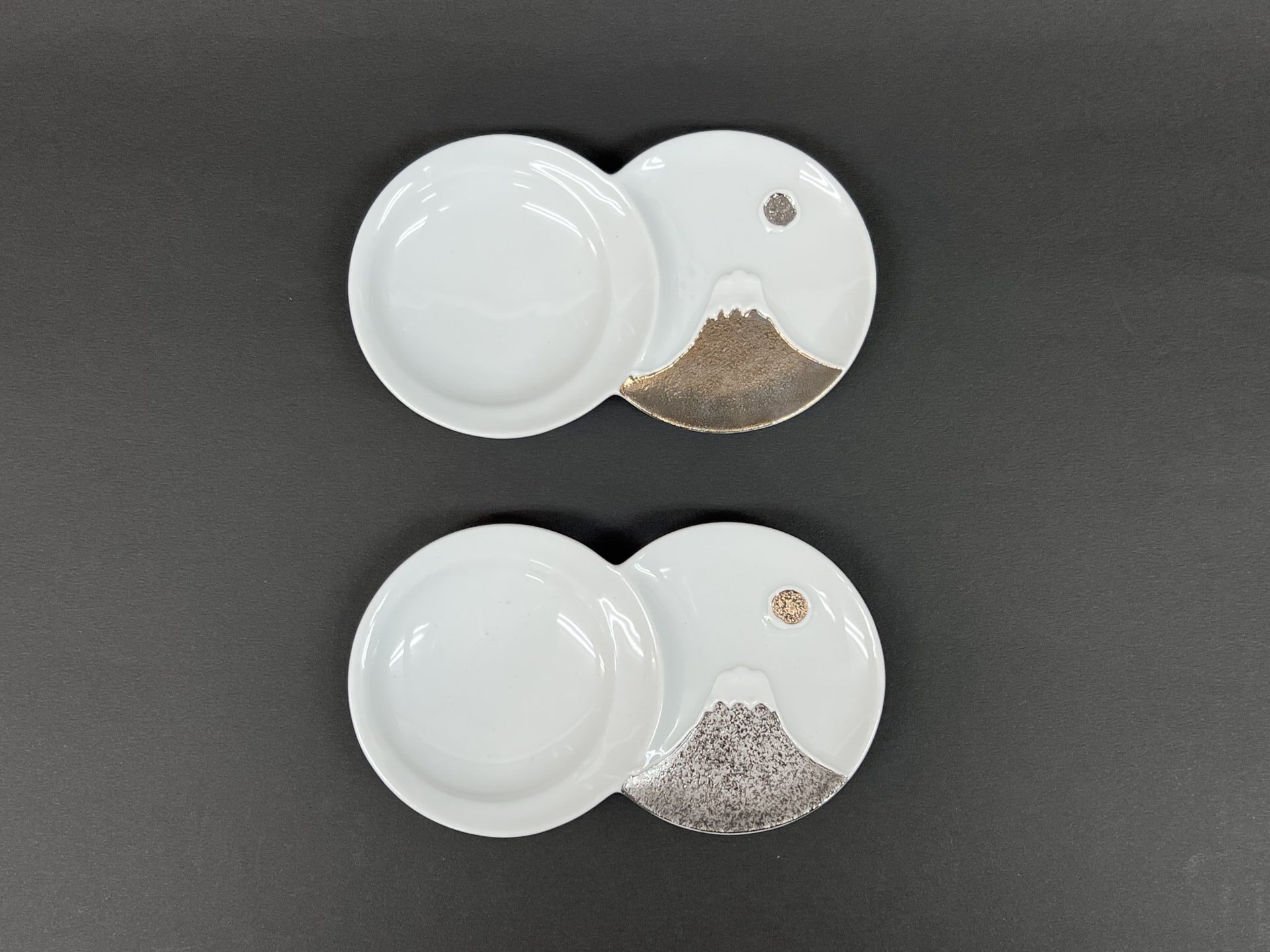 富士山と月が金と銀で交差しており、日の出にも夜月にも見える世界観が小さな仕切り皿に込めらており、